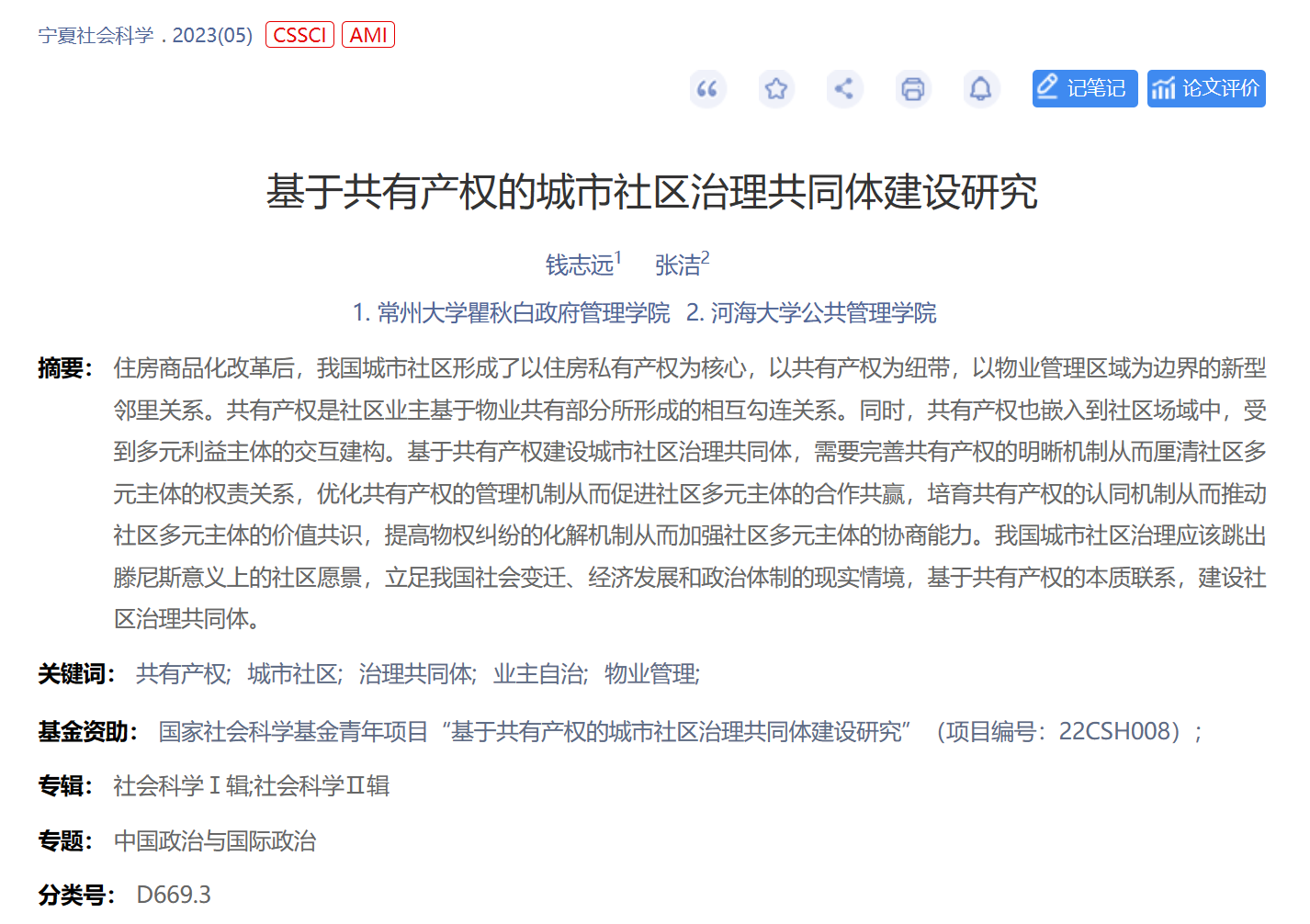 国产精品 青年教师钱志远博士在《宁夏社会科学》2023年第5期发表文章,题为《基于共有产权的城市社区治理共同体建设研究》。该文章是钱志远博士主持的国家社会科学基金青年项目“基于共有产权的城市社区治理共同体建设研究”的阶段性成果。