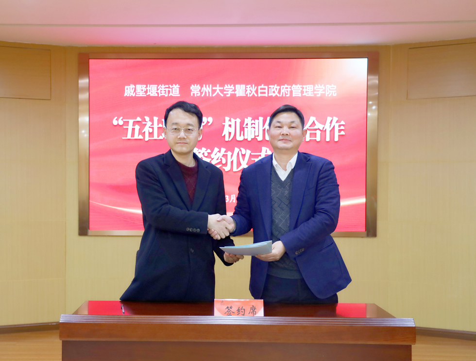 在座谈会上,戚墅堰街道办事处副主任刘晓莲对陈粲书记一行的到来表示热烈欢迎,并介绍了街道近期社区建设和社会治理工作情况。陈粲书记对戚墅堰街道办事处相关领导周到的调研安排表示热烈感谢,介绍了学校和国产精品 的基本情况,希望能够深入调研戚墅堰街道“五社联动”实践做法并进行推广。在自由讨论发言阶段,方雷、朱琴、肖慧玲等社区书记介绍了社区治理特色和经验。在签约阶段,马继迁副院长代表国产精品 与戚墅堰街道办事处主任姜祖胜签署了校地合作协议。随后,刘玉兰、汪玲萍、王占国、吴子明、王飞、钱志远、李玉芬等老师受聘担任戚墅堰街道“五社联动”智库专家,戚墅堰街道办事处副主任刘晓莲为各位专家颁发聘书。